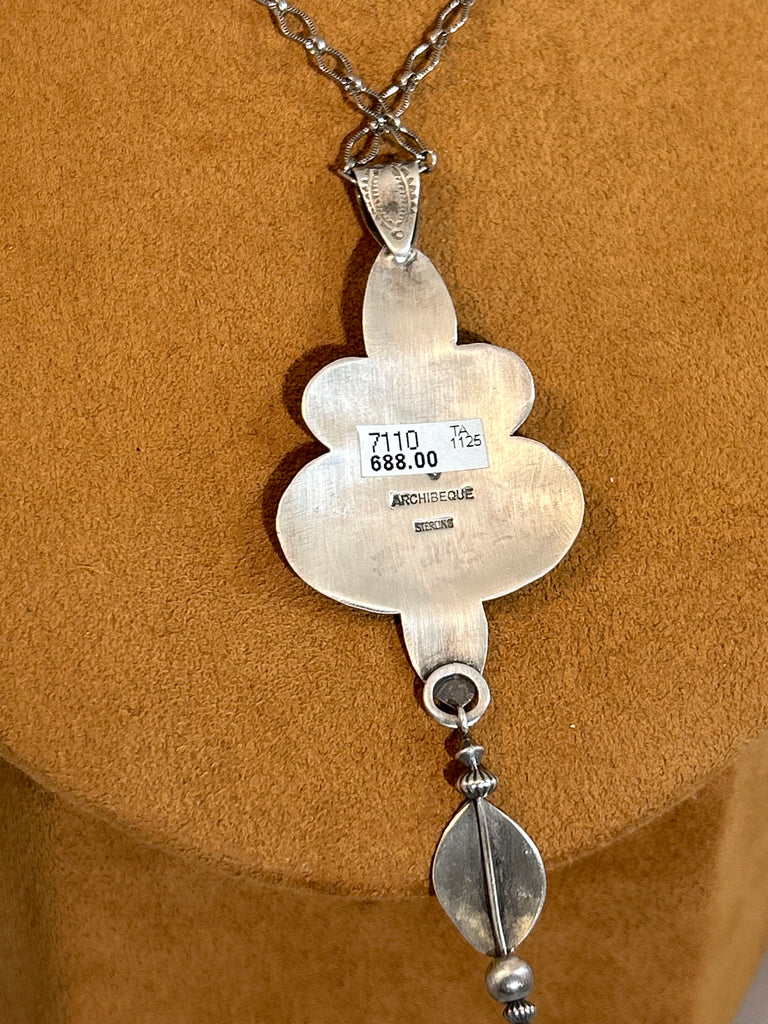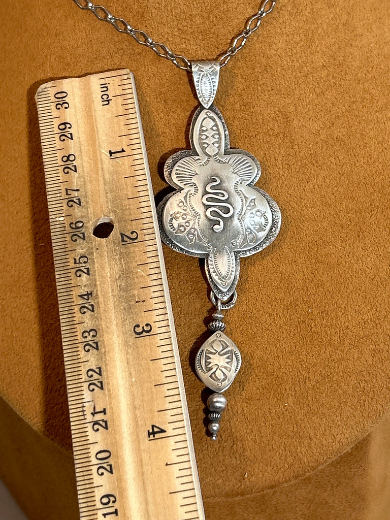 Featuring Teresa Archibeque's Iconic snake and hand stamping of sterling silver. Sterling Silver Chain is 18" and pendant is another 4." Maade in New Mexico.