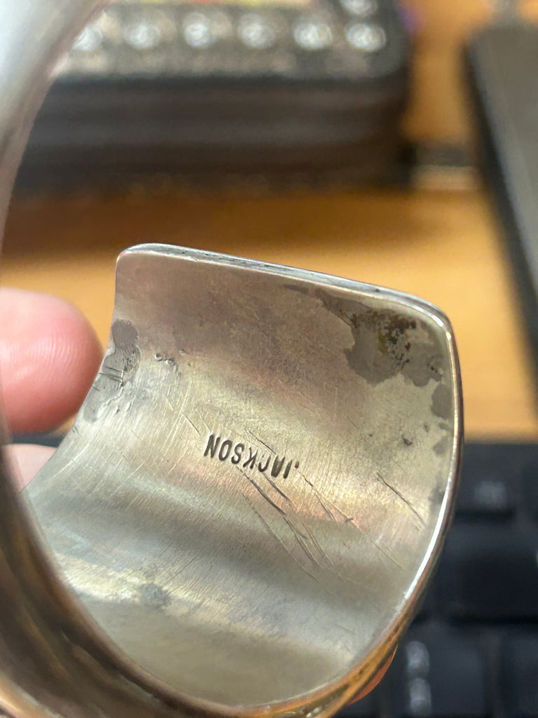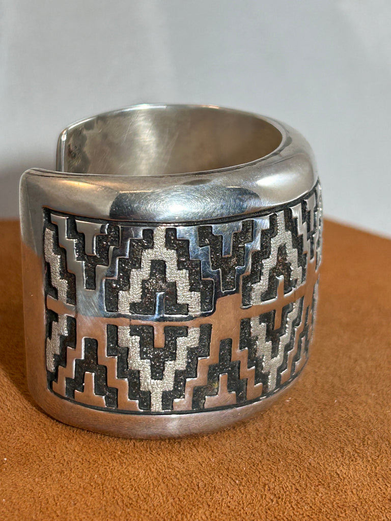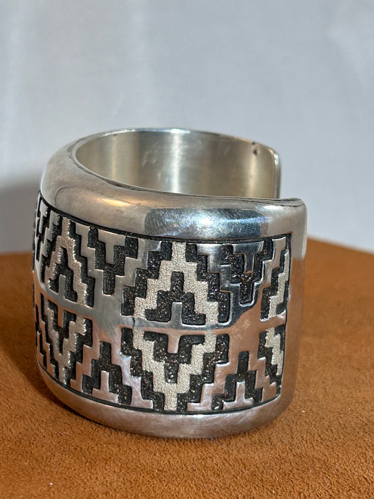 This Incredible Sterling Silver cuff was made by the Late Great Navajo Artist, Tommy Jackson. It show cases his amazing overlay technique and the varying texture on this is incredible bracelet. Cuff measures 5” with 1 3/8 gap. It weighs 132 grams. (Please note slight imperfections of piece from previous wear. This is a vintage piece but not old enough to make YOU pay for the imperfections 10% because of imperfections)
