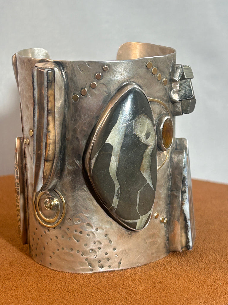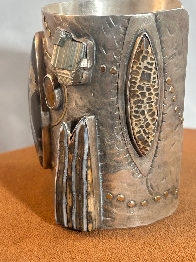 An Incredible Cuff featuring Orthoceras fossil (fossilized ancient Squid) and fossilized mammoth tooth. This cuff also contains druzy and rustic diamonds. The stones are set in sterling silver and are embellished with 18k and 22k gold. Cuff measures 5 3/4" with 1" gap the gap is wider at one end to allow for easy placement. The cuff can also be carefully opened and closed for a better fit.
