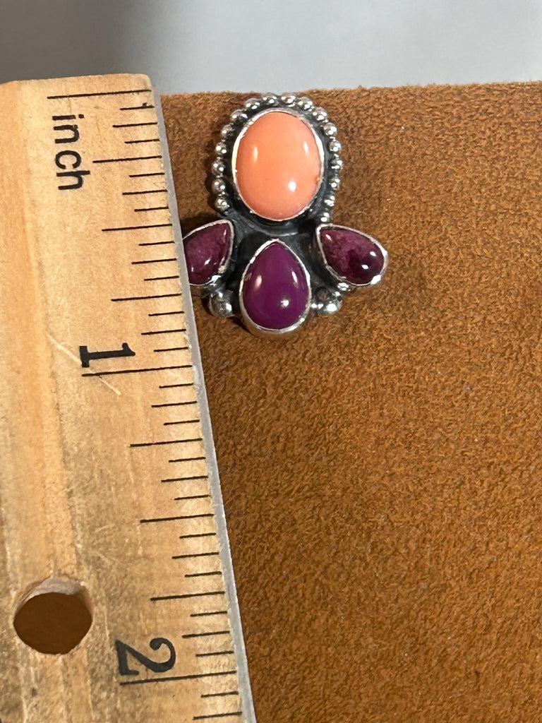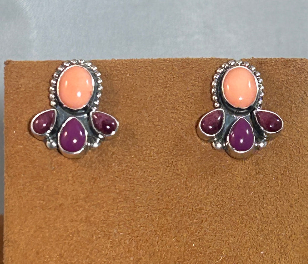 A lovely color combination. These earrings feature Pink Coral and Deep Sugilite set in sterling silver.