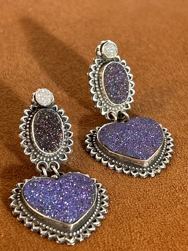Incredible Sparkly Heart Earrings with Three types of Druzies set in sterling silver.