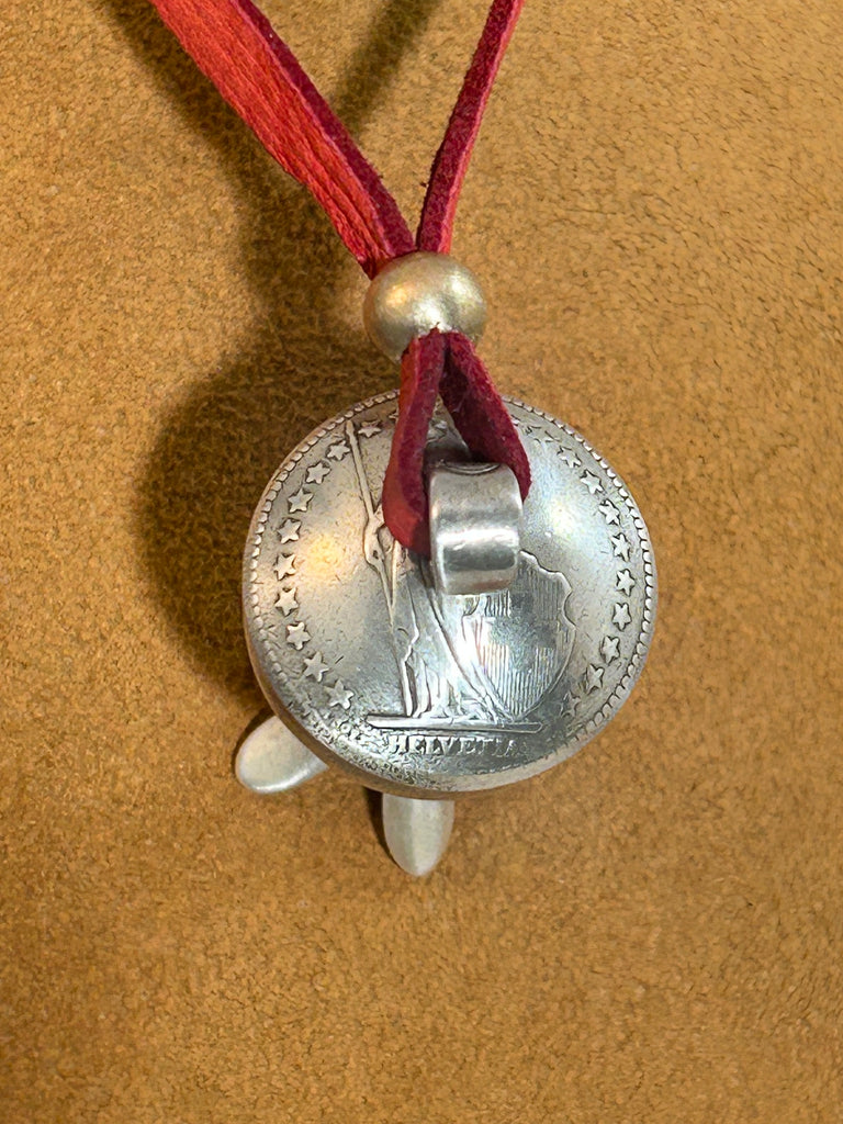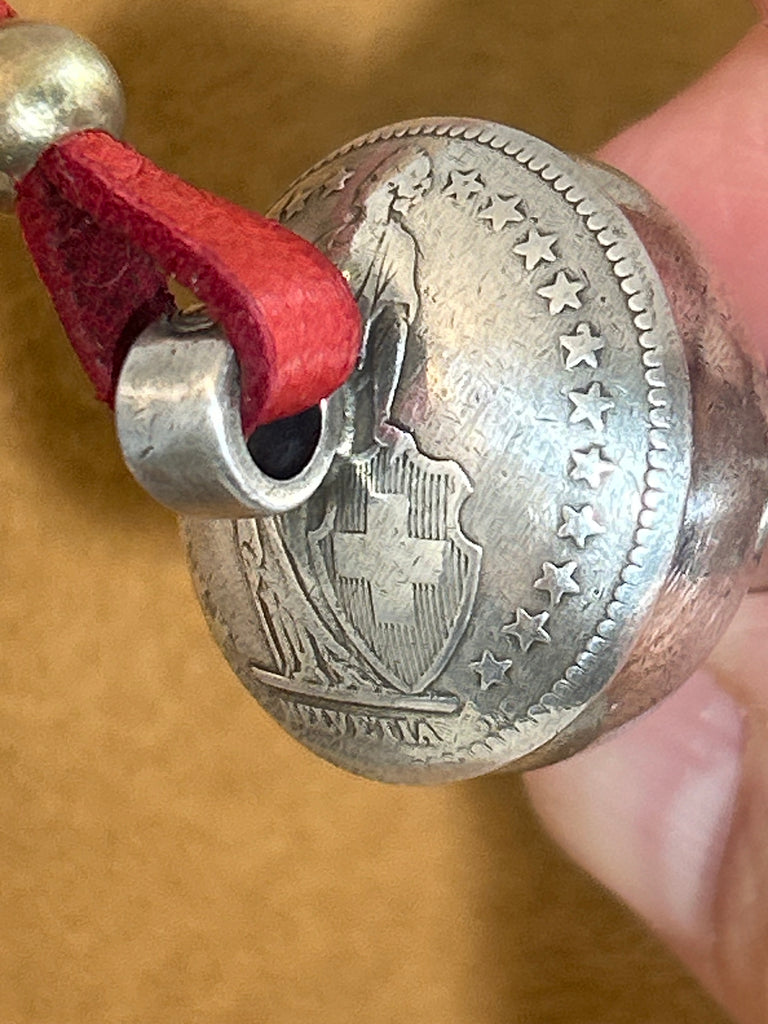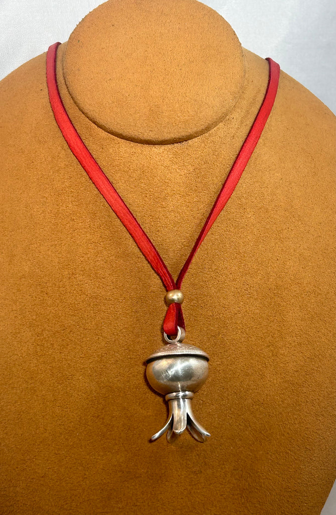 A Classic and elegant Sterling Silver Blossom featuring an intricate Swiss coin Dome and a mini fluted blossom. Blossoms hang from an adjustable leather cord.