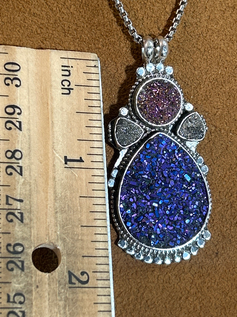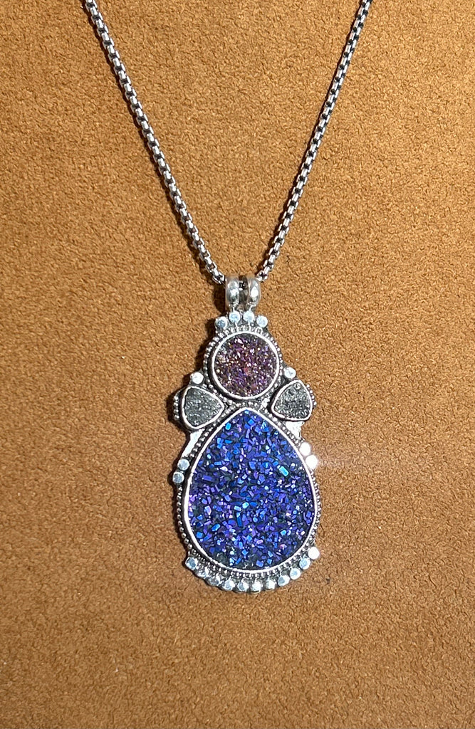 Add Sparkle to your outfit with this gorgeous Druzy pendant of three types of druzy set in sterling silver to resemble an angel. Pendant hangs from a 20" sterling silver chain.