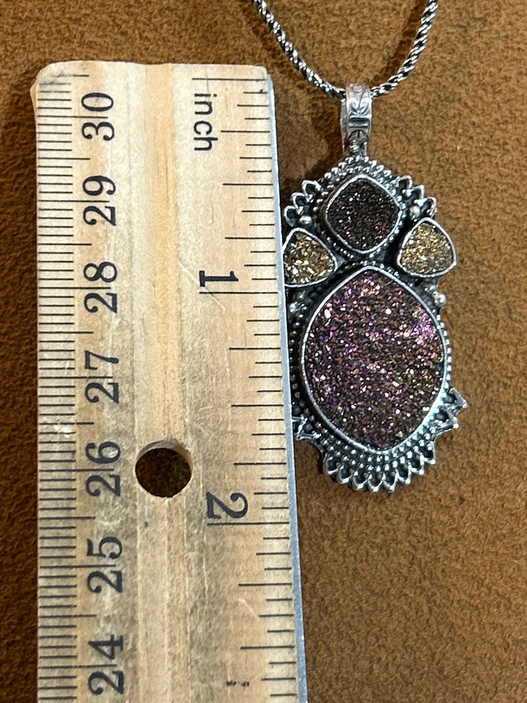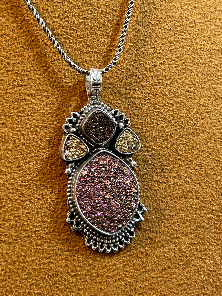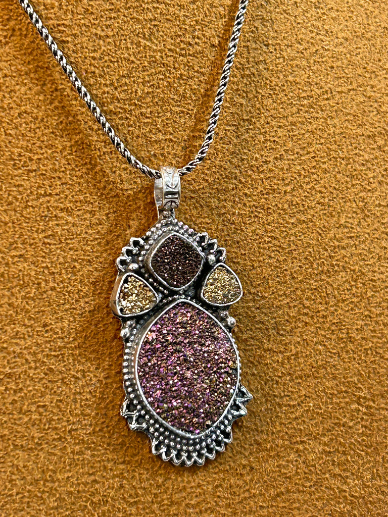 Add Sparkle to your outfit with this gorgeous Druzy pendant of three types of druzy set in sterling silver to resemble an angel. Pendant hangs from a 20" sterling silver chain.