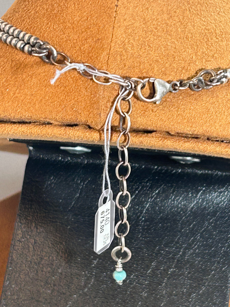 Two Strands of Graduated Sterling Silver Beads and a gorgeous square Pendant of Sonoran Gold. Necklace is 15" with a 3 inch extender so it can hang longer or shorter. The extender has a matching turquoise bead. Designed and Made in New Mexico.