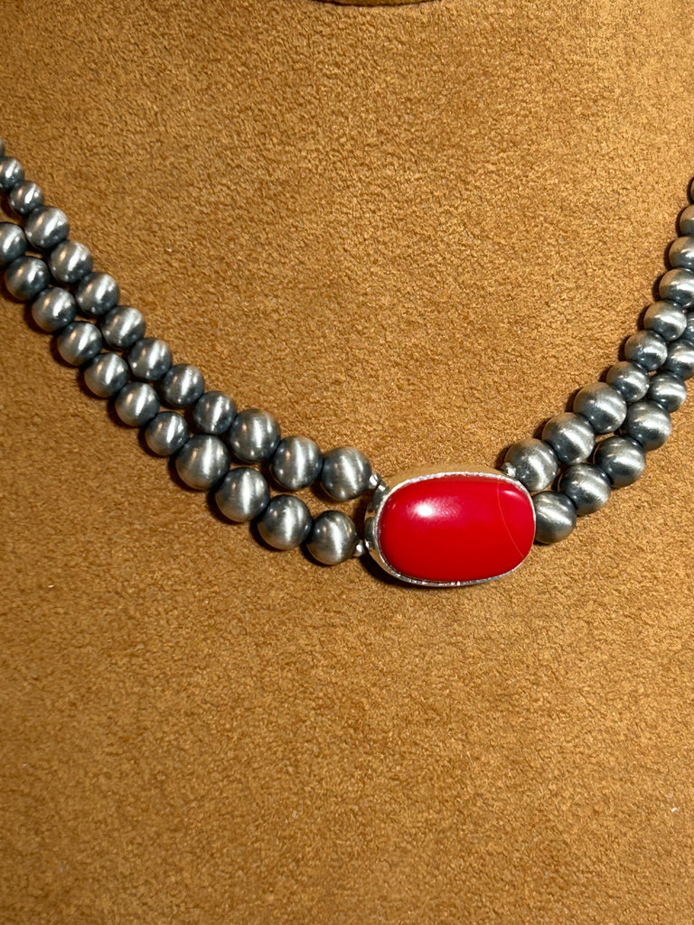 Two Strands of Graduated Sterling Silver Beads and a gorgeous square Pendant of Deep Rosarita. Necklace is 15" with a 3 inch extender so it can hang longer or shorter. The extender has a matching coral nugget bead. Designed and Made in New Mexico.
