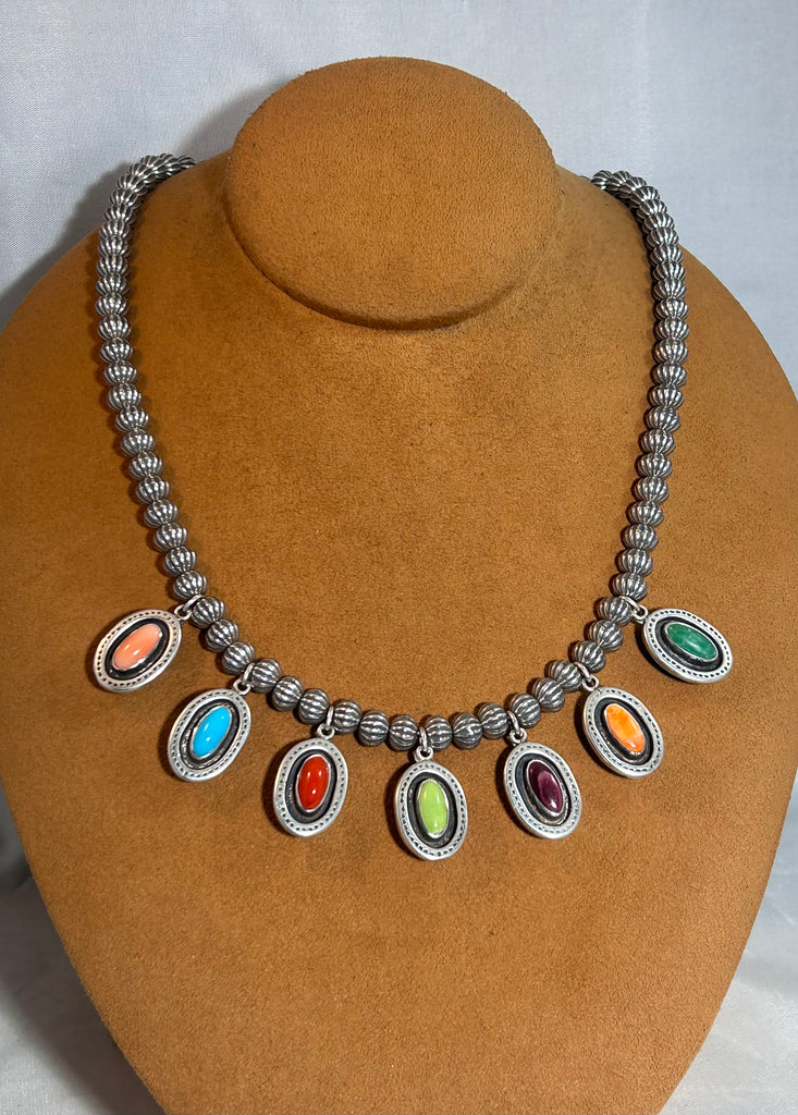 Brilliant Sterling Silver Multi-Semi Precious Stone Necklace featuring Lovely Spiny Oyster, Coral, Gaspeite and Turquoise. The other side is Onyx! This necklace is 19-21 inches depending on where you place the hook.