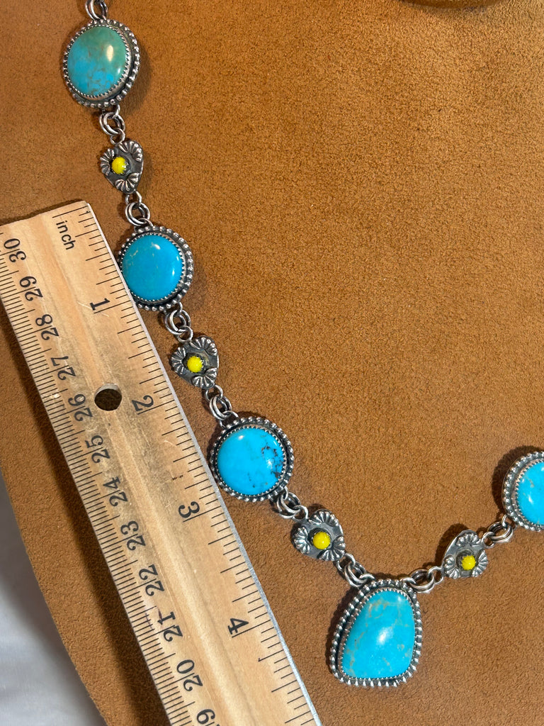 Gorgeous and meticulously crafted necklace of sterling silver, Kingman Turquoise and Yellow Rosarita. 22” made in New Mexico