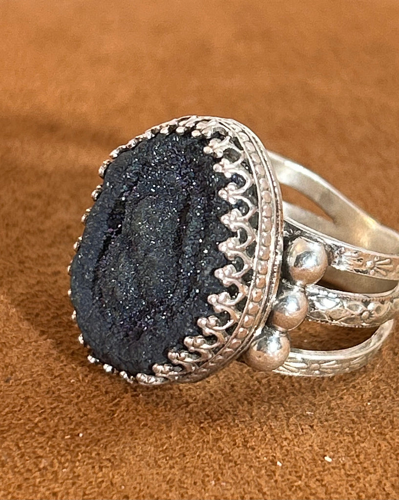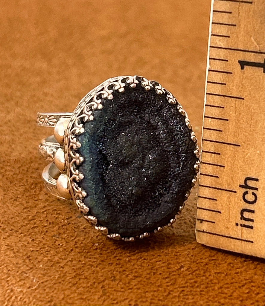 Deep Magic with this dark blue druzy. It is set in sterling silver with intricate stamping on the ring.