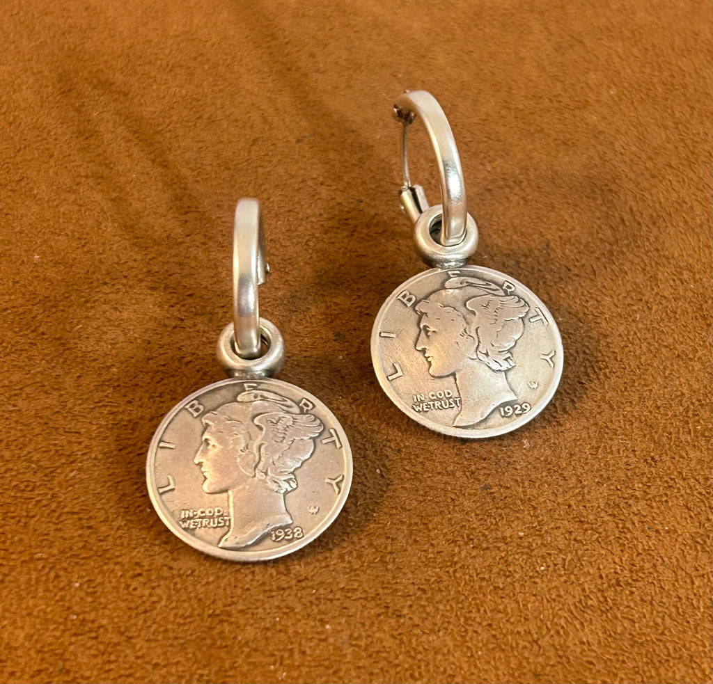 Made from Vintage Dimes and attached to a sterling silver bale with a sterling silver hoop. Made in New Mexico .