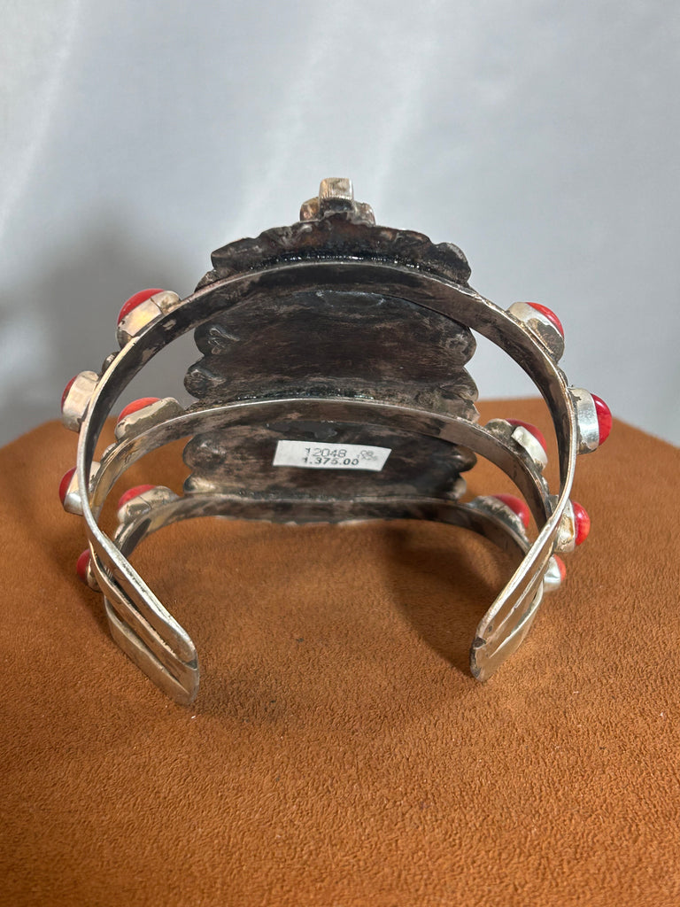 This one-of-a-kind Cuff Features a vintage handmade wooden kachina doll set in Sterling Silver surrounded by Mediterranean Coral and Kingman Turquoise. The crosses are made of Kingman Turquoise and Freshwater Pearl. Cuff measures 5 3/8 with a 1 1/2” gap. At its highest point cuff is 3” tall..